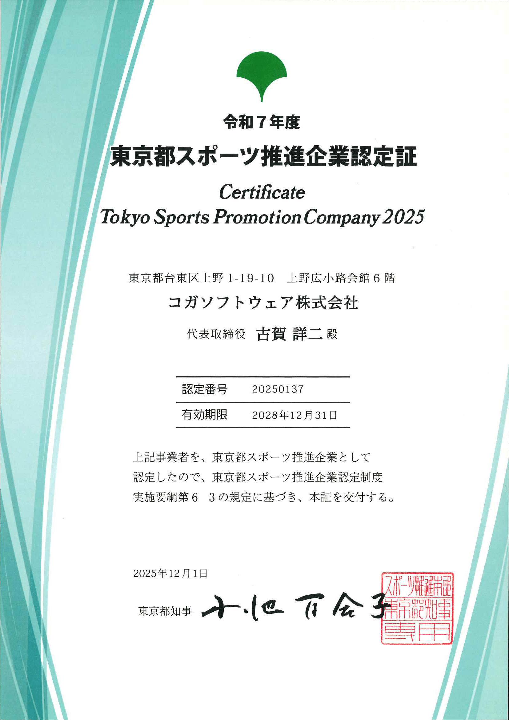 システム開発のコガソフトウェア株式会社は、東京都で従業員のスポーツ活動の促進やスポーツ分野での社会貢献の取組を実施している企業として、2025年12月1日付けで東京都が選定する「東京都スポーツ推進企業」に認定されました。