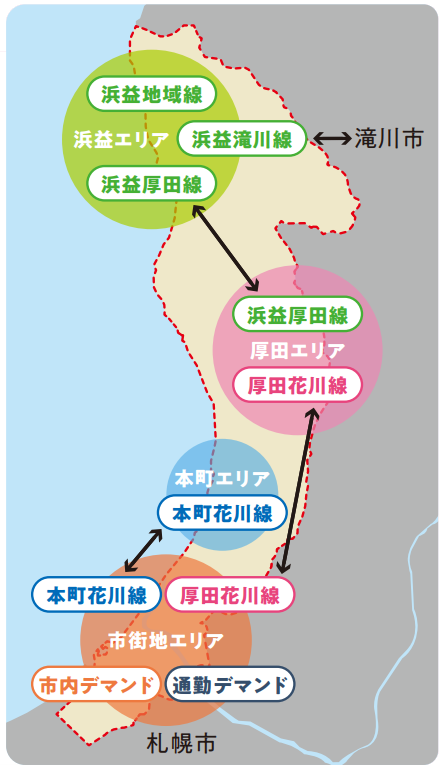 • 市内デマンド:生振・緑苑台・花川地域等、中心市街地の日常生活を支える足。